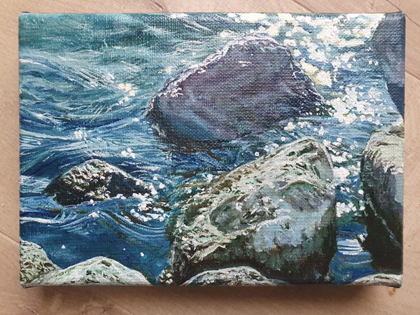 Een klein olieverfschilderijtje op canvas. Ik hou van het vangen van de sprankelingen van water en glas. Er zitten enorm veel kleurschakeringen in beide onderwerpen en zowel bij water als glas is sprake van vervormingen, reflecties, transparantie en scherpte die met grotere vlakken afwisselt. Hier is een moment gevangen van ondergaande zon aan de waterkant in Hoorn, na een sfeervolle dag schilderen op Montmartre op de Roode Steen. Het schilderijtje is te koop na droging en eerste vernis.