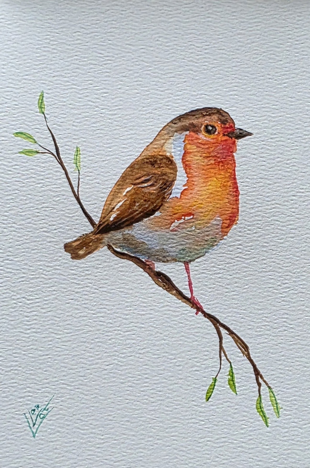 Voor het eerst met klein palet waterverf van een goed merk mijn muze het roodborstje op waterverfpapier geschilderd