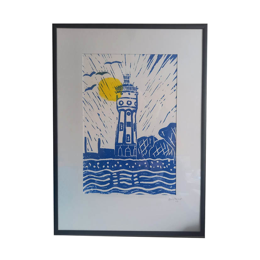 Linodruk van de watertoren van Zwijndrecht. Deze toren is kenmerkend door zijn een Eclectische, aan de Hollandse Renaissance verwante bouwstijl.