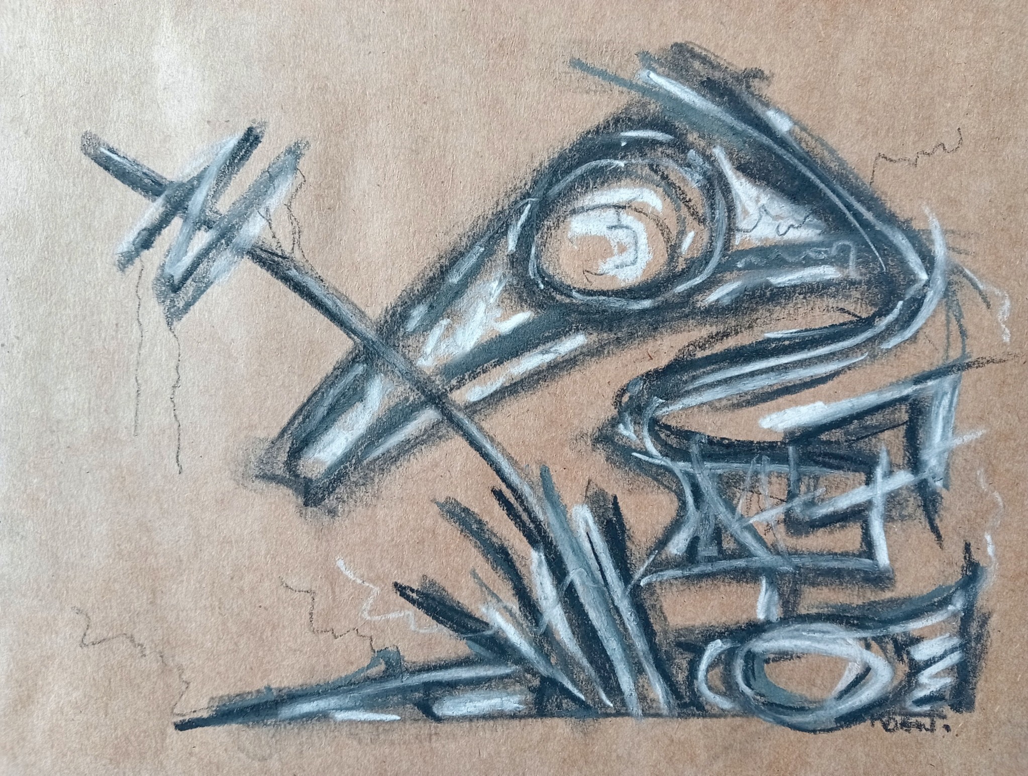 Houtskool en schoolbordkrijt op hergebruikt karton.