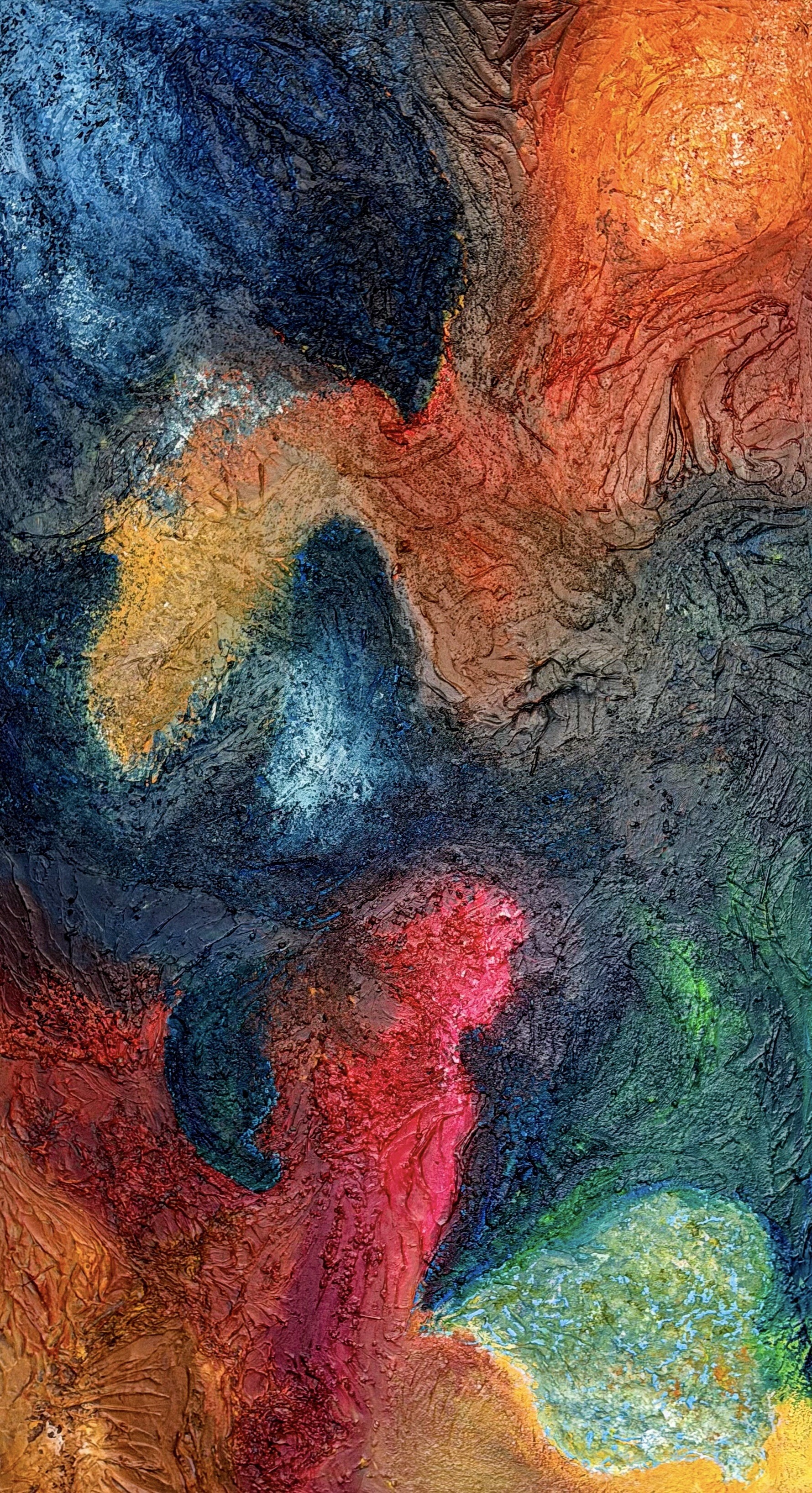 In dit monumentale werk lijkt het oppervlak te ademen. De diepe structuren en krachtige kleuren voelen als sporen van alles wat geleefd, gevoeld en doorstaan is. Ruwe lagen botsen en verzachten tegelijk alsof pijn, groei en hoop elkaar hier ontmoeten. Het doek nodigt uit om niet alleen te kijken, maar te voelen: als een landschap van binnen, waarin elke barst en glooiing een herinnering draagt aan het leven zelf. Er is gebruik gemaakt van veel verschillende materialen: zand, steentjes, schelpjes, pasta, stro en houtsnippers