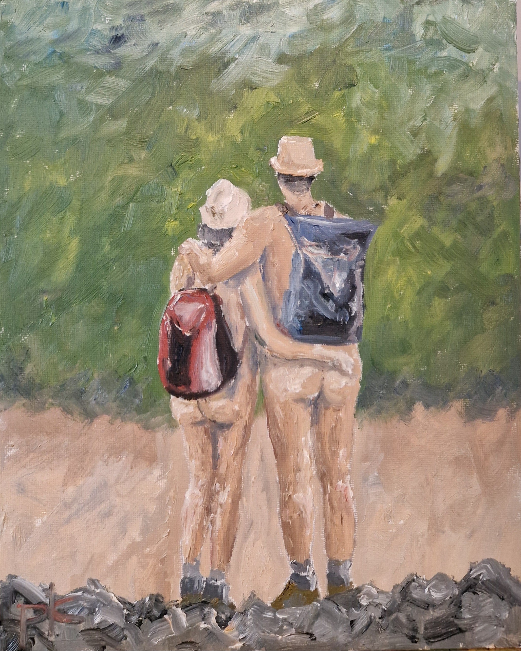 "Will You Be My Valentine?" toont een teder moment tussen twee personen, omringd door de rust van de natuur. Hun ruggen zijn naar ons toegekeerd, wat een gevoel van intimiteit en verbondenheid oproept. De persoon links draagt een rode rugzak, een symbool van avontuur en passie, terwijl de ander een donkere tas bij zich heeft, gevuld met herinneringen of dromen. De zachte kleuren en losse penseelstreken van het landschap achter hen benadrukken de serene sfeer, alsof de wereld even stilstaat voor dit speciale moment. Dit schilderij nodigt de kijker uit om na te denken over liefde, verbinding en de eenvoudige schoonheid van gedeelde ervaringen. Het is een tijdloze uitnodiging: "Will you be my Valentine?" — een vraag die niet alleen op 14 februari, maar elke dag gesteld kan worden.