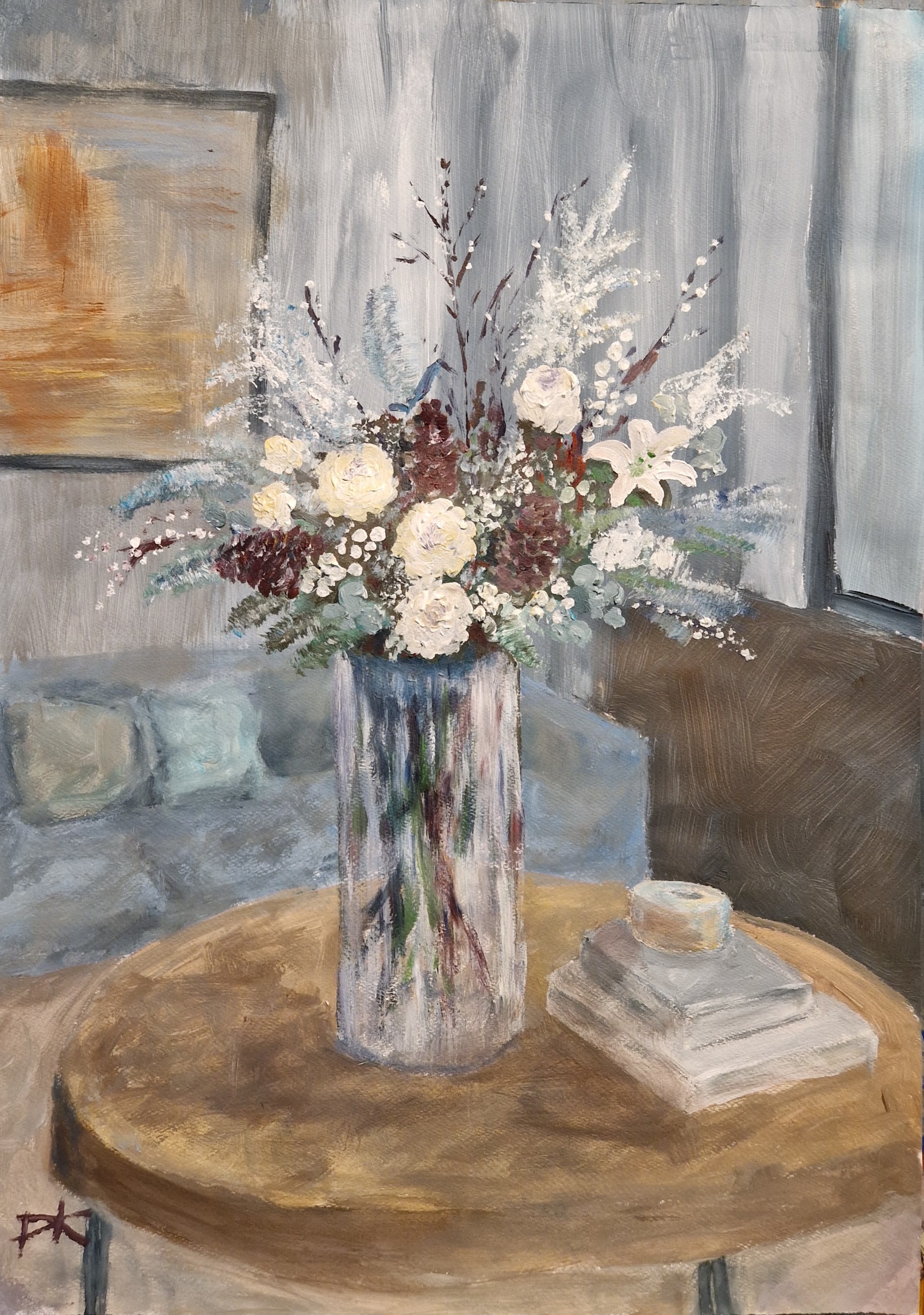 In Winter Bouquet wordt je uitgenodigt tot verstilling. Het bloemstuk — samengesteld uit bleke rozen, wintertakken en gedempte groentinten — staat centraal, maar lijkt bijna op te gaan in zijn omgeving. De koele grijzen en blauwen van het interieur verzachten de vormen en laten licht en sfeer belangrijker worden dan detail.