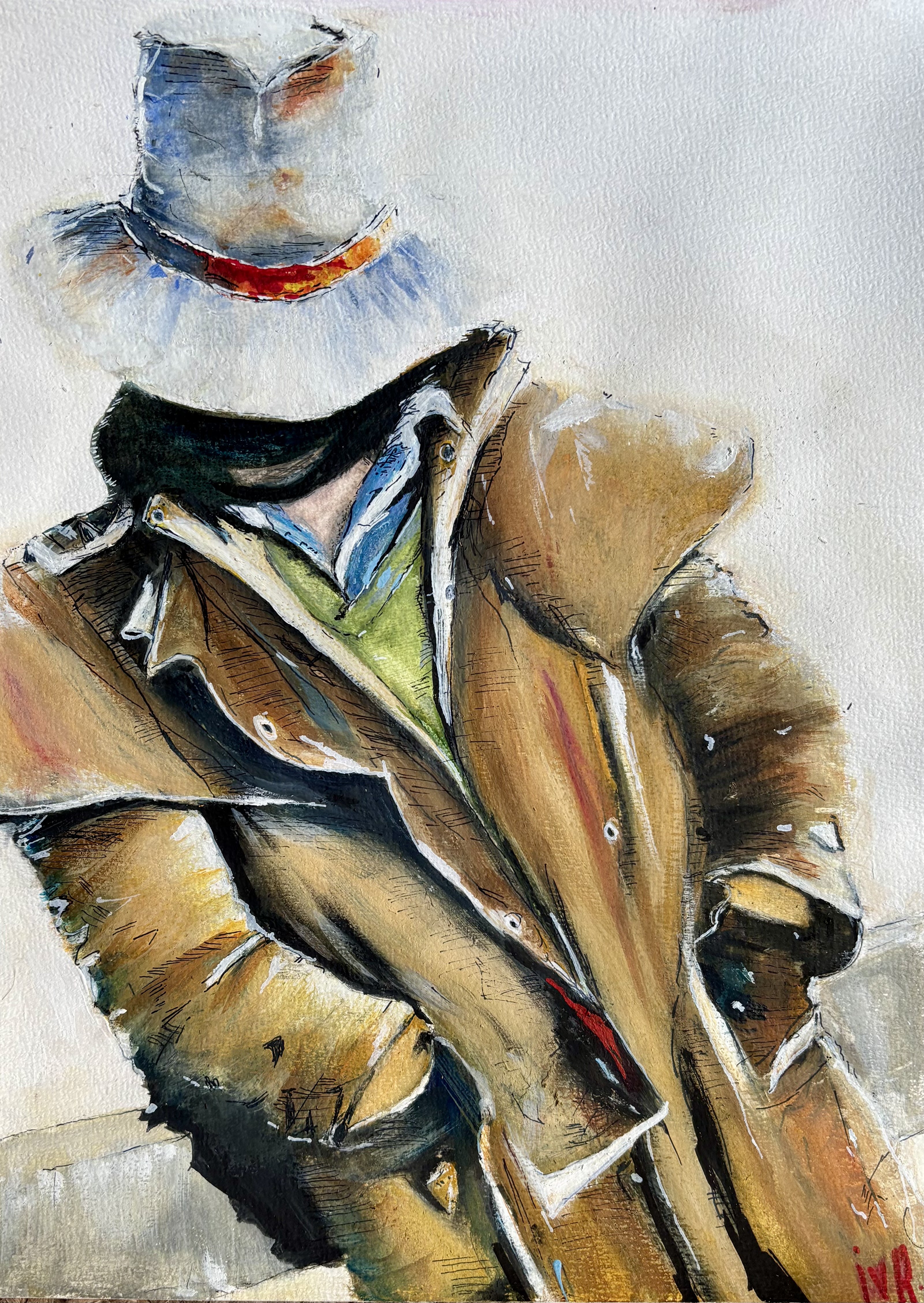 Hij hangt in zijn waxjas alsof het zijn laatste bescherming is. De hoed zakt laag, verbergt ogen die te veel hebben gezien. Het hek draagt hem waar hij zichzelf even niet kan dragen. Maar hij is er nog.