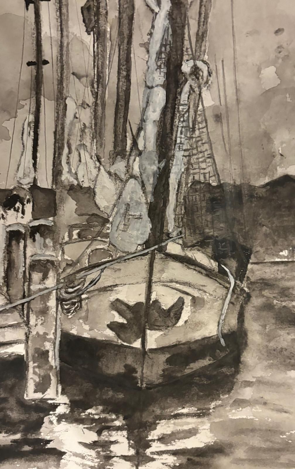 Met 1 kleur zwart guas gewerkt en beetje dek wit . Goede licht donker study . Helaas scheef getrokken mast , maar zij zo .