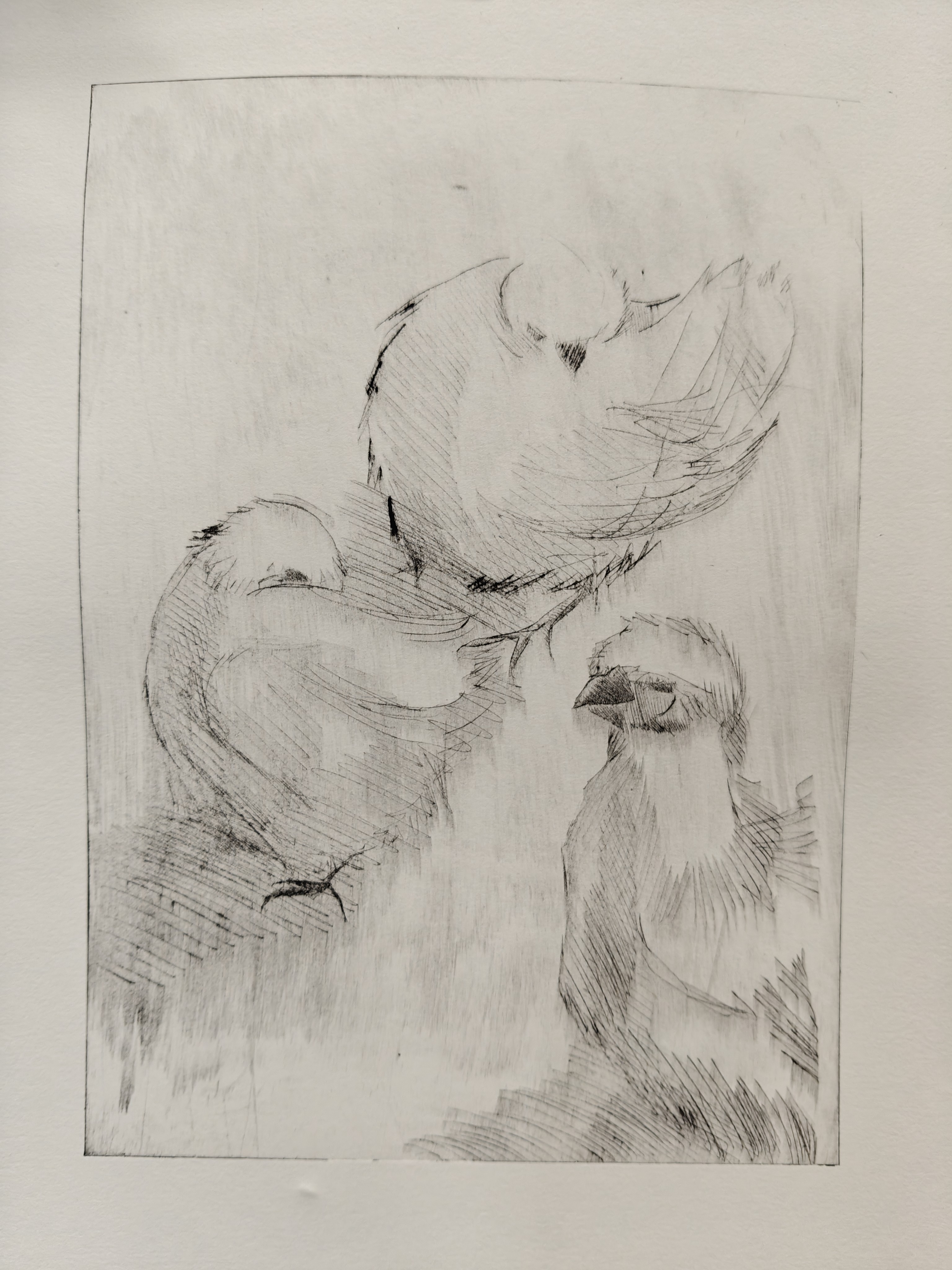 Ets van een snelle schets van onze zijdehoenders scharrelend in de tuin