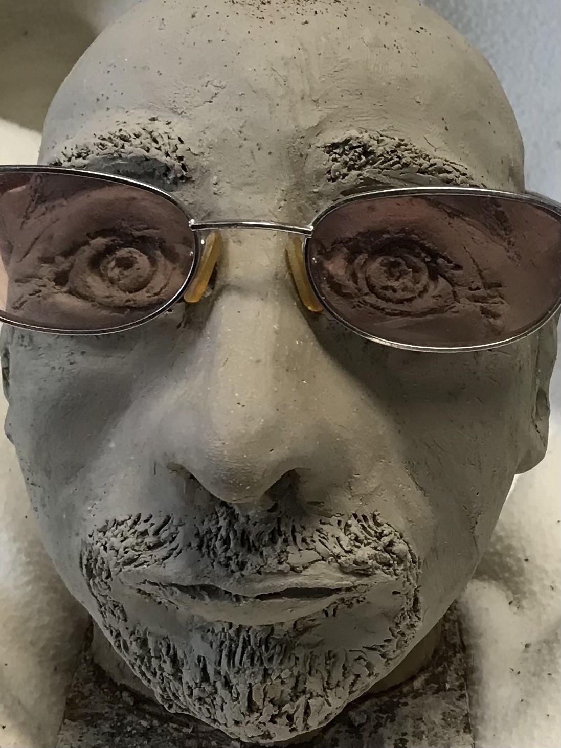 Grap met boetseer portret , juist de te grote bril is ludiek . Potret van een voor mij dierbaar persoon .