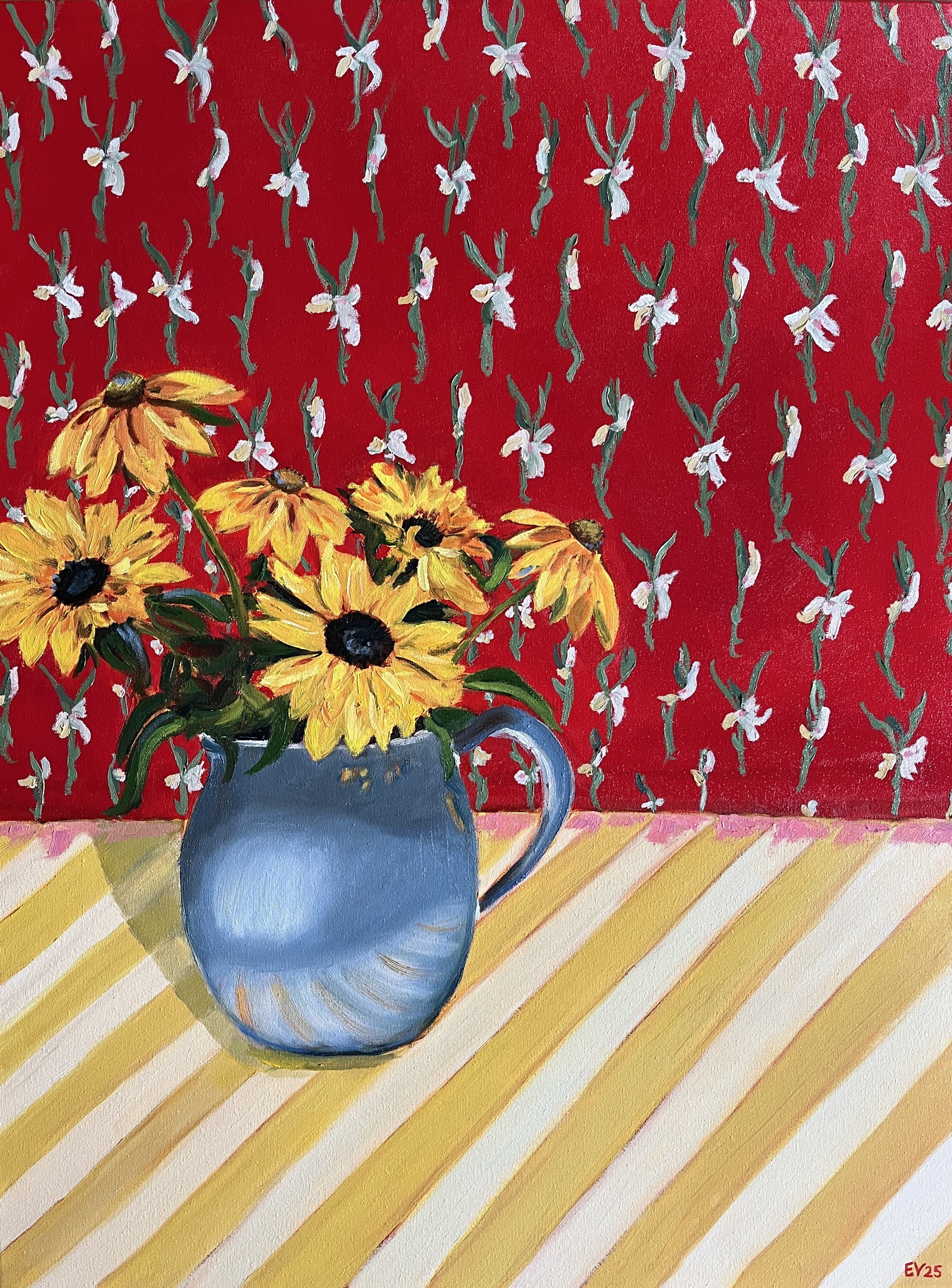 Olieverf op linnen. Naar eigen compositie. Nazomerwerk met contrasterende kleuren en patronen. Een eigen kader gekozen door de vaas met bloemen net af te breken aan de linker kant, maakt het interessant om naar te kijken wat mij betreft.