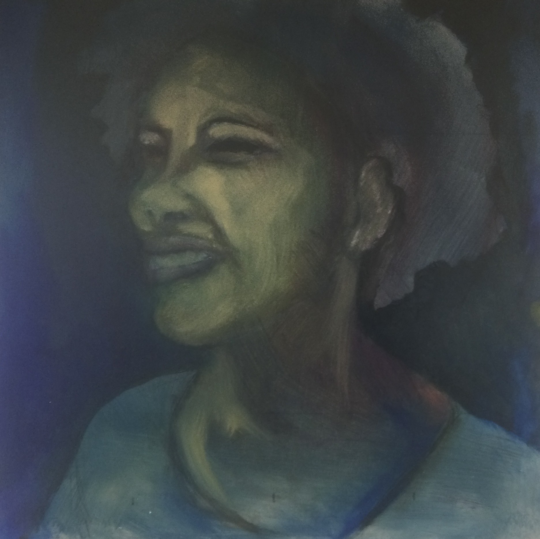 Portret van een kleurrijke vrouw. Olieverf op mdf.
