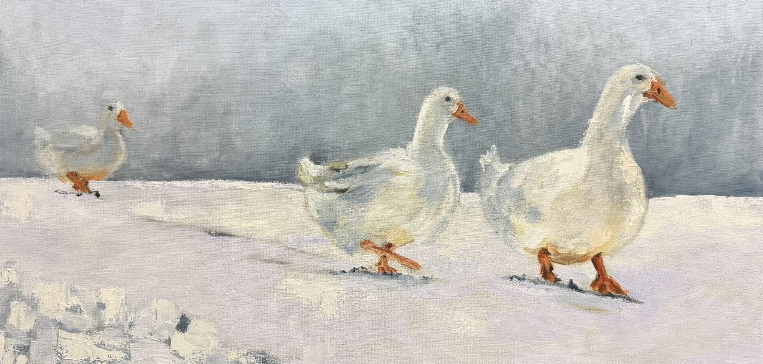 Opvallend is hoe het kleurgebruik sober blijft, maar nergens koud of afstandelijk wordt. De zachte overgangen in wit en grijs geven het schilderij lucht en stilte, terwijl de warme accenten in snavel en poten zorgen voor leven en menselijkheid.